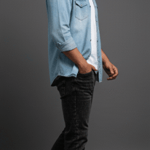 Men’s Washed Black Denim Biker Jacket with Stand Collar & Graphic Detail