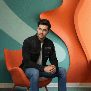 Men’s Washed Black Denim Biker Jacket with Stand Collar & Graphic Detail