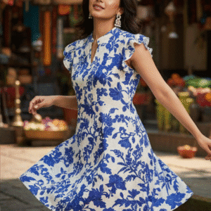 Elegant Blue Floral Printed Short Dress for Women
