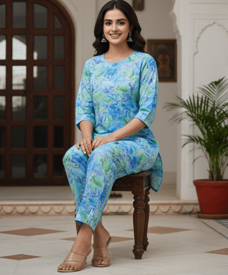 Experience timeless elegance with M&TChic Green Long Pprinted Co-Ordset Co-Ordset for Women. Crafted with fine attention to detail, this outfit offers unmatched comfort and chic style. Designed for the modern woman, itideal for both casual and festive outings. Pair it with elegant accessories and step out in confidence.