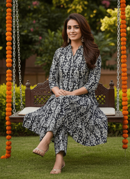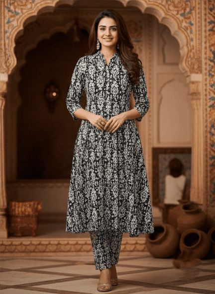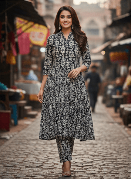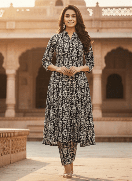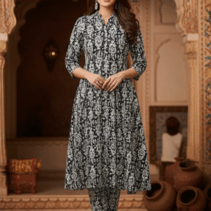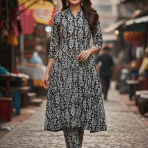 Be the first to review “Elegant Black Printed Long Kurti Set for Women”