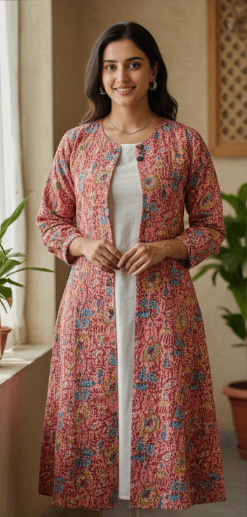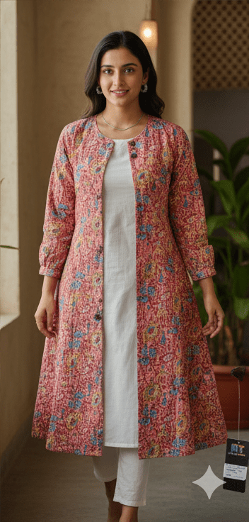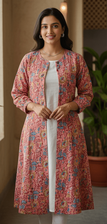 Experience timeless elegance with M&TElegant Pink Full Sleeves Printed Jacket for Women. Crafted with fine attention to detail, this outfit offers unmatched comfort and chic style. Designed for the modern woman, itideal for both casual and festive outings. Pair it with elegant accessories and step out in confidence.