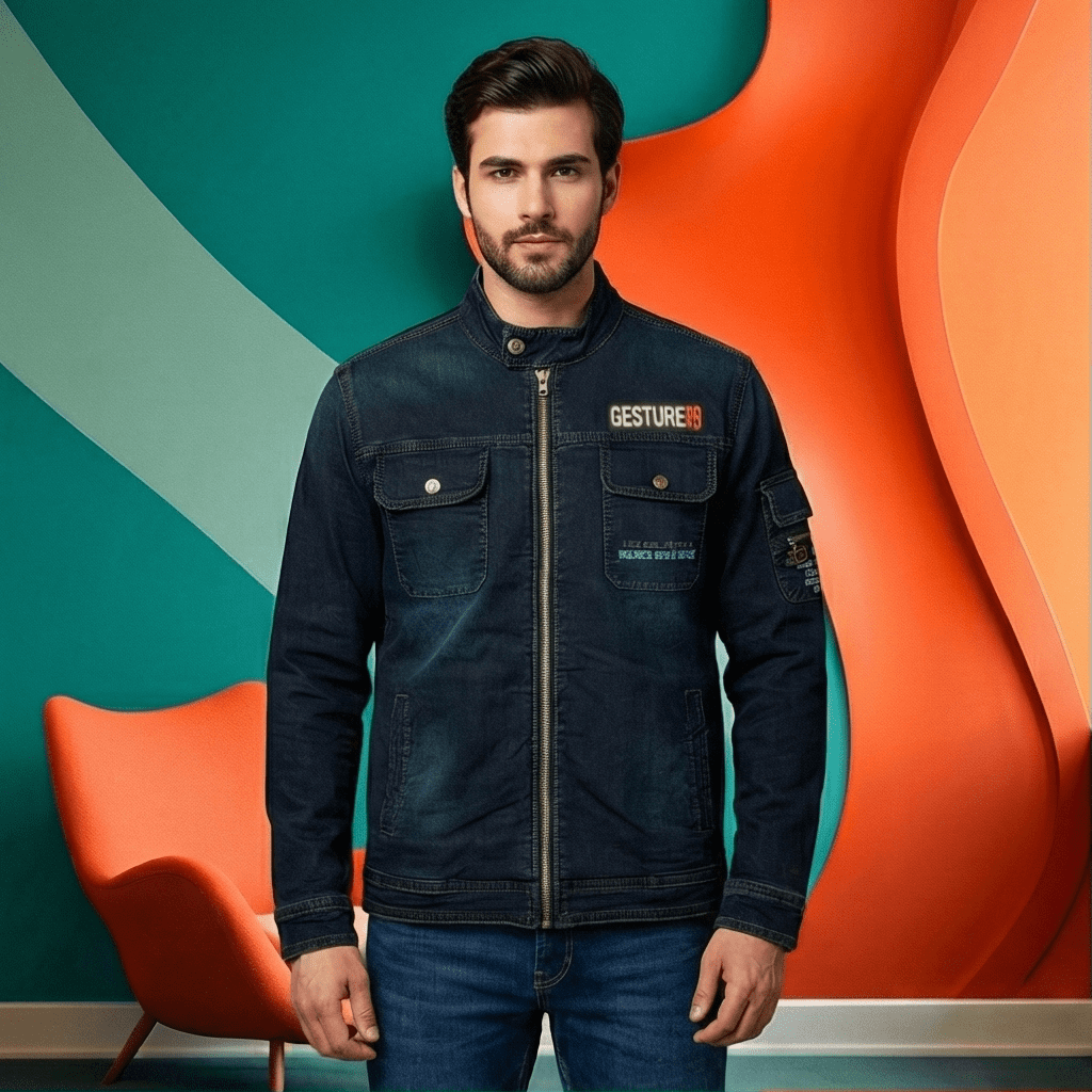 Men’s Dark Blue Indigo Denim Biker Jacket with Stand Collar & Utility Sleeve Pocket