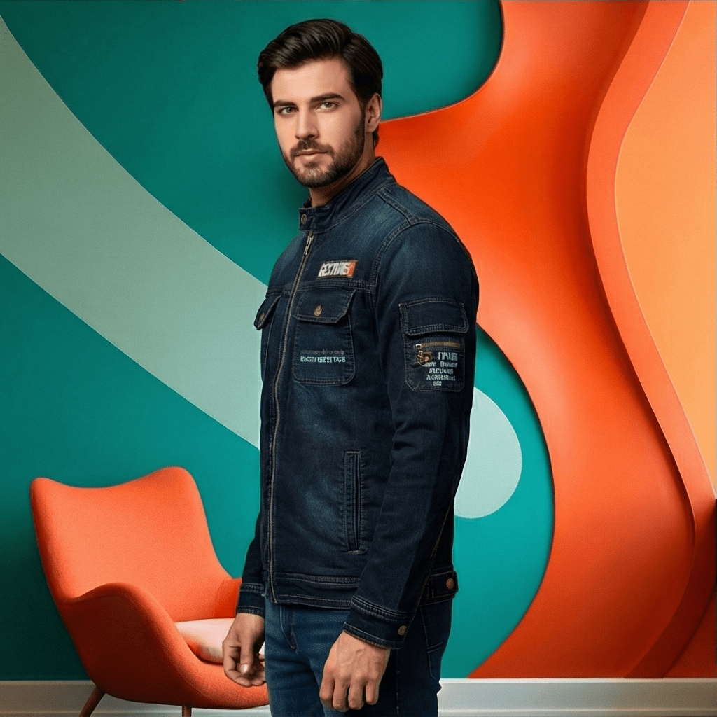 Unlike traditional button-down trucker jackets, this piece is designed with a sleek stand collar and a robust full-length metal zipper, giving it a sharper, biker-inspired silhouette. It is highly functional, featuring two button-flap chest pockets, side hand pockets, and a distinctive zippered utility pocket on the left sleeve for added convenience.