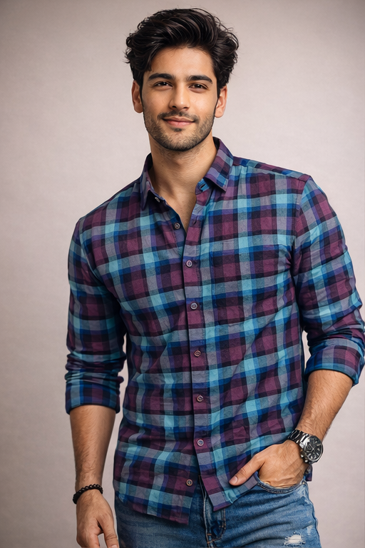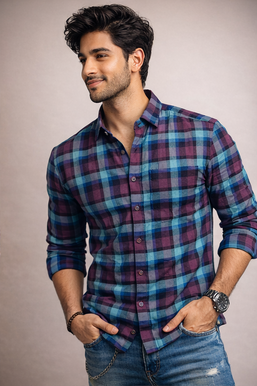 The rich peacock green checkered pattern adds a premium and modern touch, suitable for both formal and casual occasions. Featuring a regular fit and full sleeves, it pairs effortlessly with jeans, chinos, or formal trousers for a smart, confident look.
