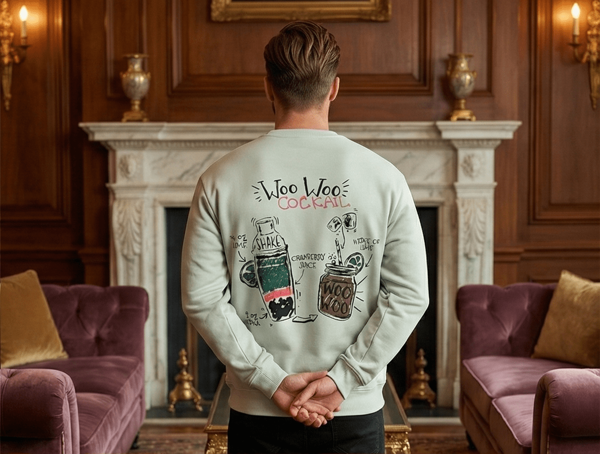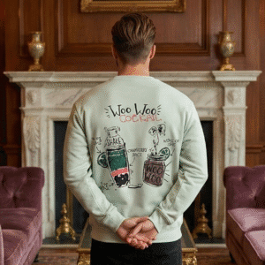 The sweatshirt features a unique and playful “Woo Woo Cocktail” themed illustration, with a small graphic on the front and a larger detailed design on the back. This artistic print gives the sweatshirt a trendy, youthful vibe.