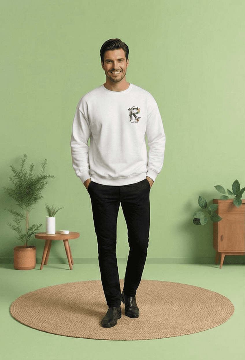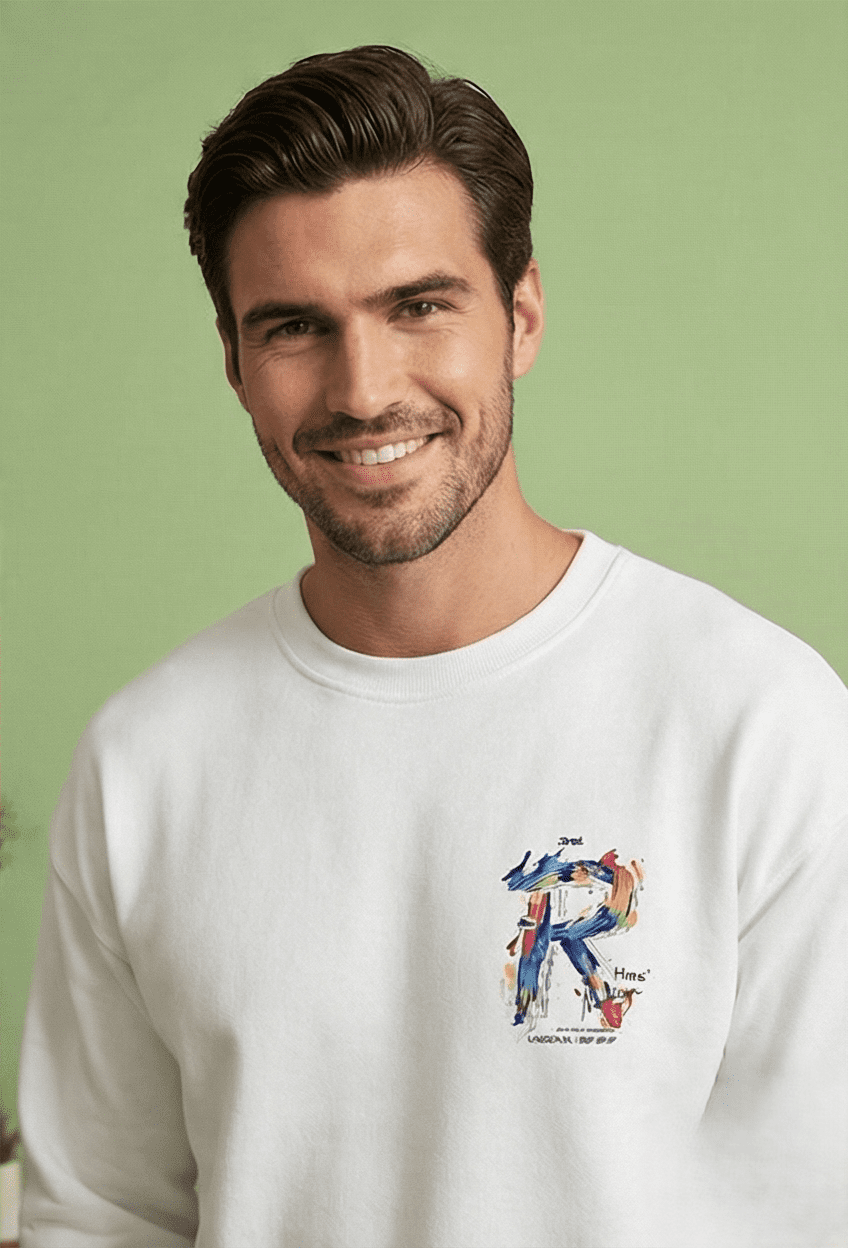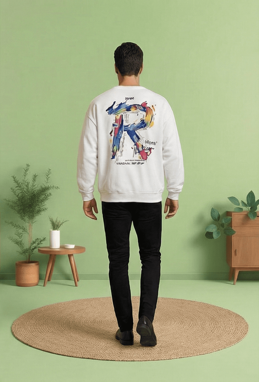 The standout feature is the vibrant multicolor artistic “R” print on the front and back, giving the sweatshirt a bold and creative expression. With its round neckline, ribbed cuffs, and ribbed hem, the sweatshirt fits comfortably while retaining a structured, modern silhouette.