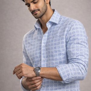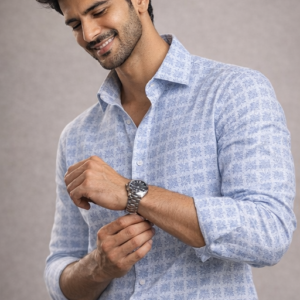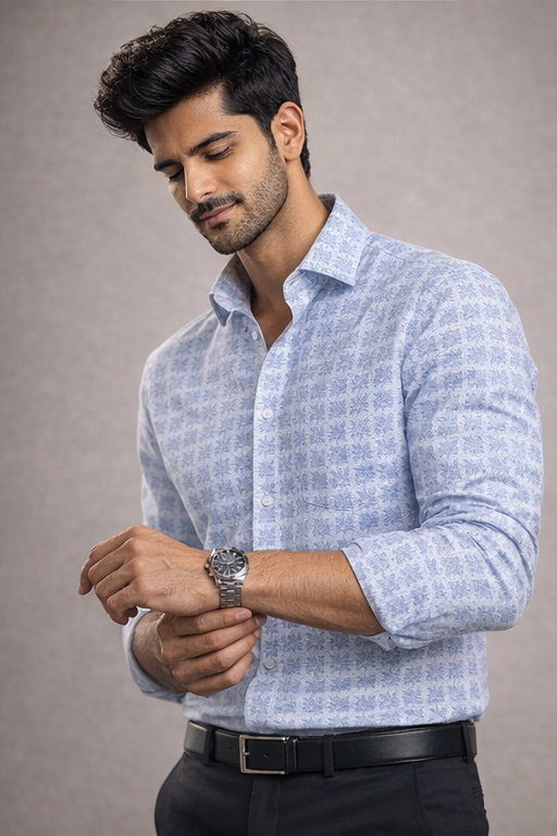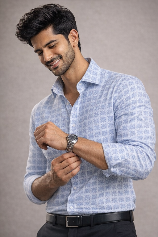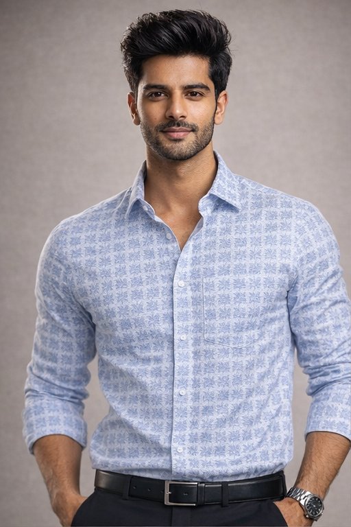 Upgrade your formal style with this elegant sky blue printed shirt for men. Designed with a smart slim fit and subtle print pattern, this shirt is perfect for office wear, meetings, and semi-formal occasions.