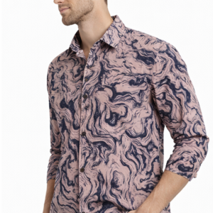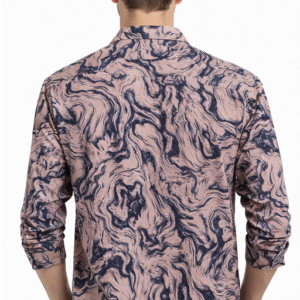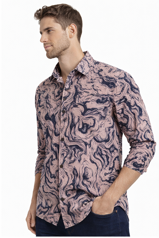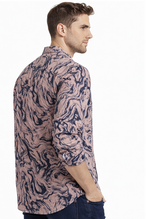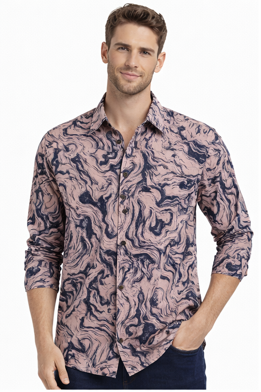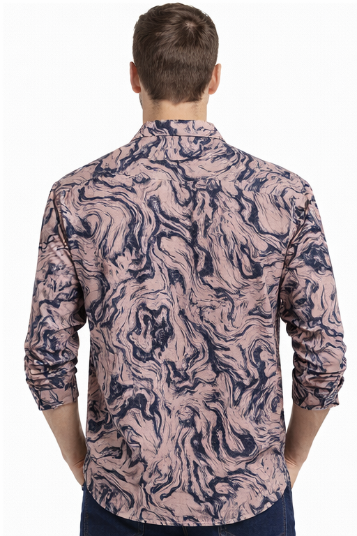 Stylish M&T men’s casual printed full sleeve shirt in peach color with trendy abstract marble print. Made from soft, breathable fabric with a comfortable regular fit—perfect for casual outings and smart everyday wear.