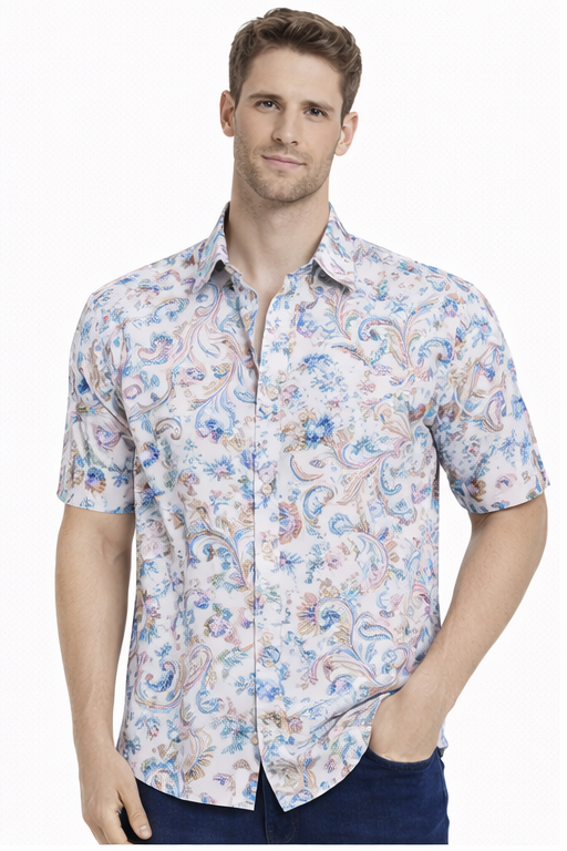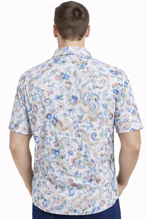 Stylish M&T men’s printed half sleeve shirt in white, featuring an eye-catching all-over print. Made from soft, breathable fabric with a comfortable regular fit—perfect for casual wear, summer outings, and daily use.