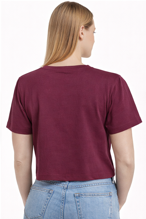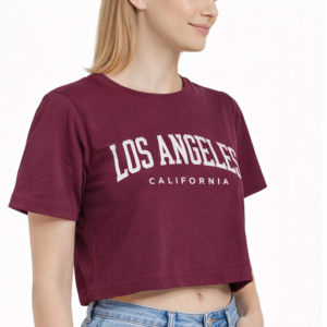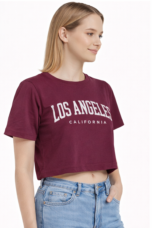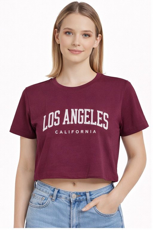 Stylish M&T women’s maroon crop top featuring trendy “Los Angeles California” text print. Made from soft, breathable fabric with a comfortable cropped fit—perfect for daily wear and casual outings.