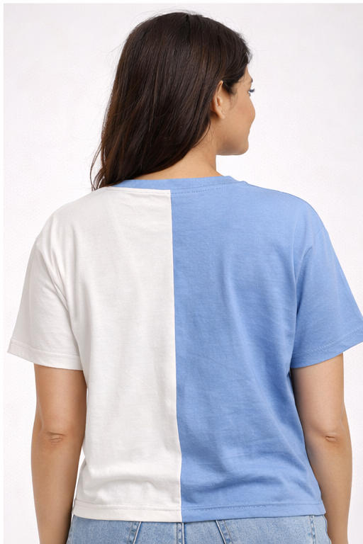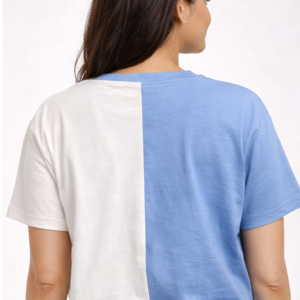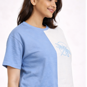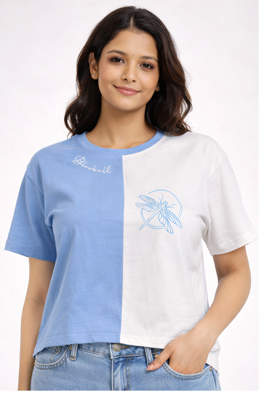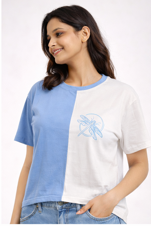 Trendy M&T women’s crop top featuring a stylish white & blue color-block design with elegant dragonfly print. Soft, breathable fabric with a comfortable fit—ideal for daily wear and casual outings.
