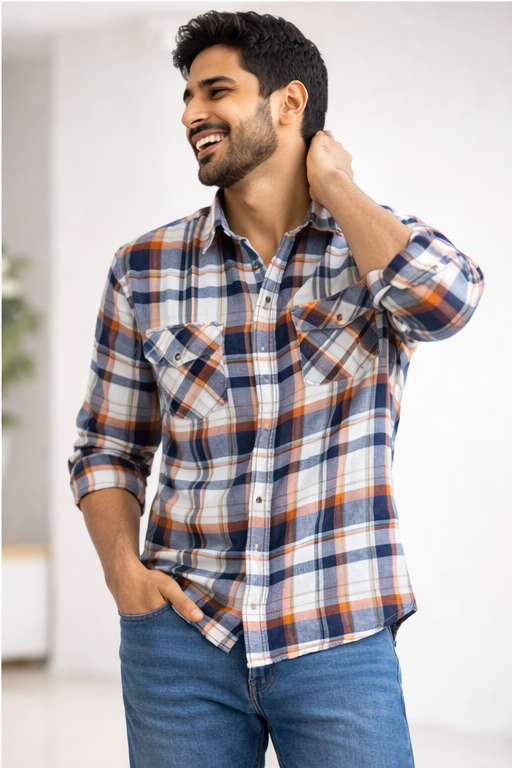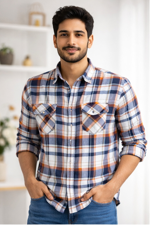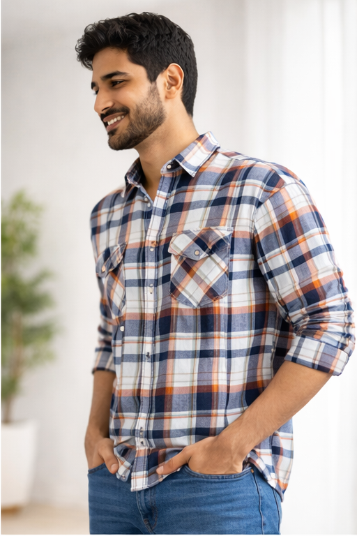 Refresh your wardrobe with this Orange-Blue Checkered Full Sleeve Cotton Shirt for Men, designed for both comfort and style. Crafted from high-quality cotton fabric, this shirt offers excellent breathability and a soft touch, making it perfect for long hours of wear.