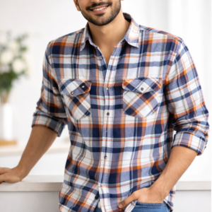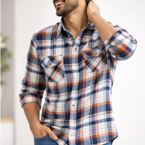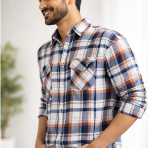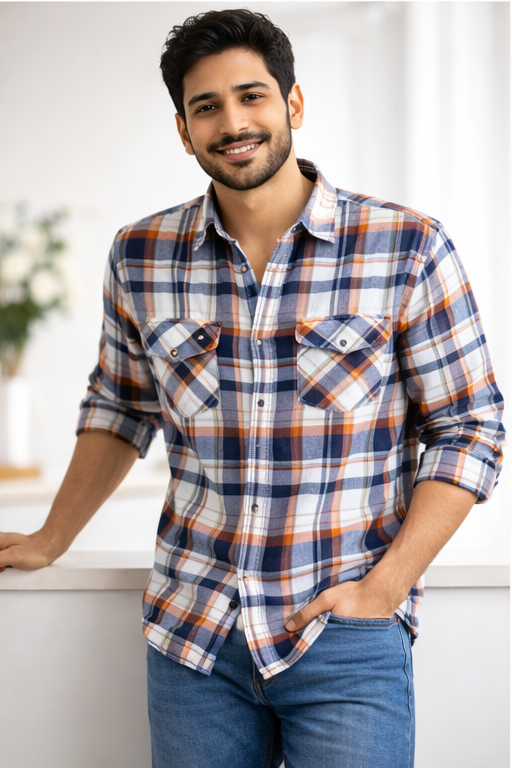 The stylish orange and blue checkered pattern adds a contemporary edge while maintaining a classic appeal, making it suitable for casual, formal, and semi-formal occasions. Featuring a regular fit and full sleeves, it pairs effortlessly with jeans, chinos, or formal trousers.