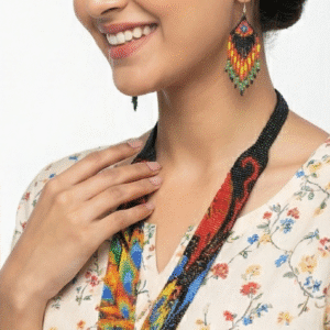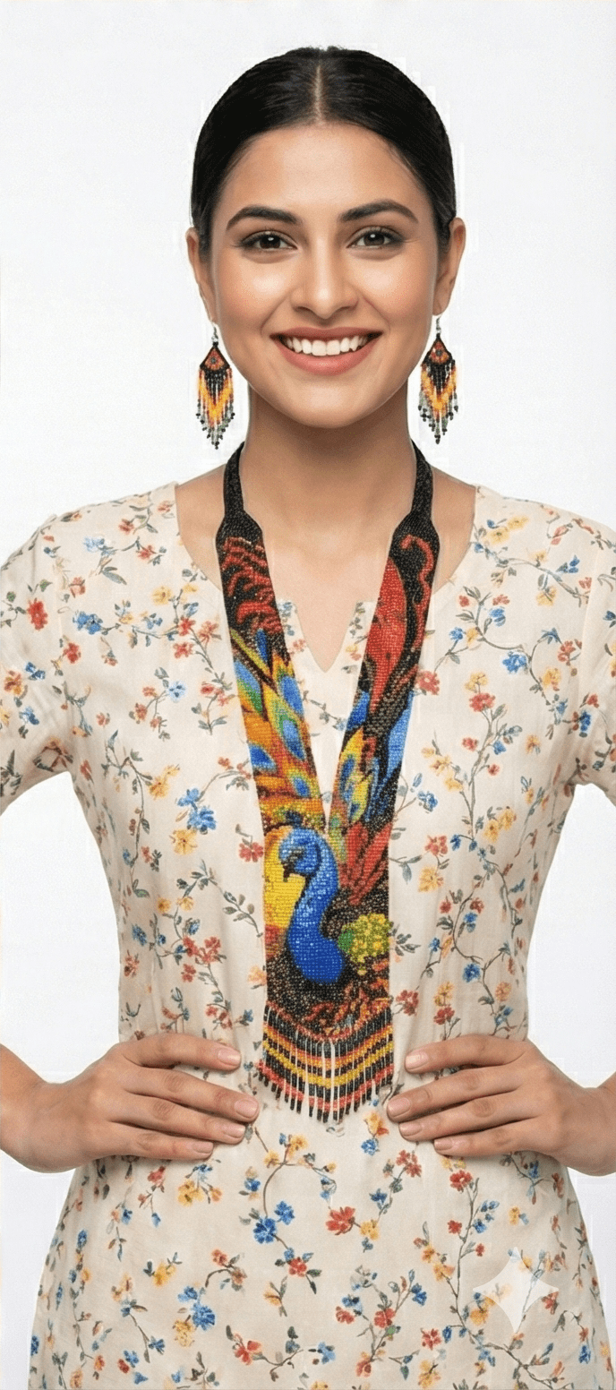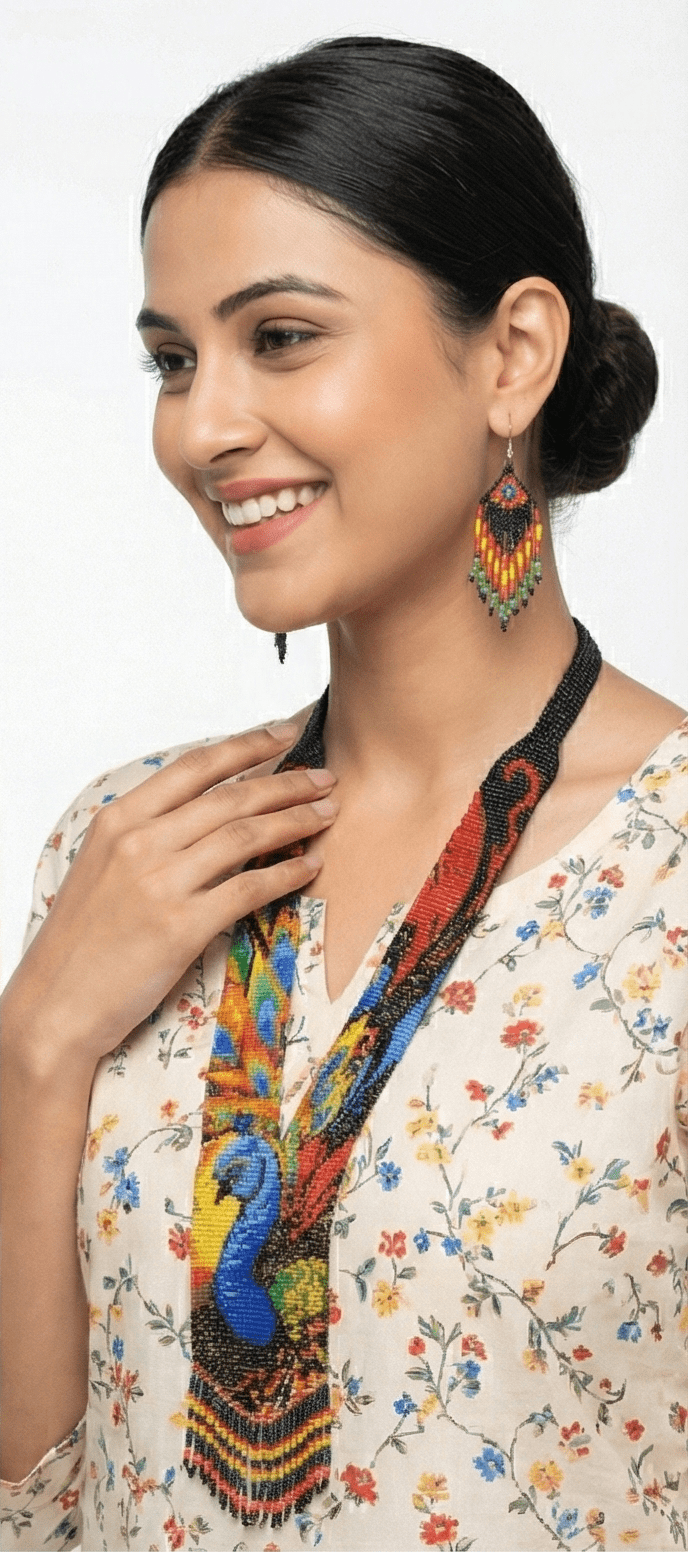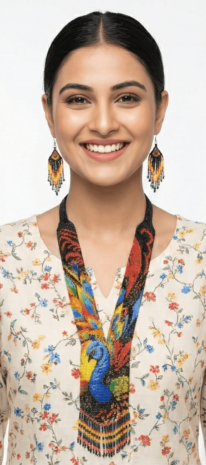 Celebrate the beauty of traditional craftsmanship with this Handcrafted Peacock Design Multicolor Beaded Necklace & Earrings Set. Designed with precision seed bead weaving, this necklace showcases a majestic peacock motif in vibrant hues of blue, yellow, red, green, and orange — creating a stunning artistic statement.