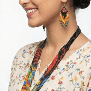 The long V-shaped necklace features smooth bead layering and a colorful fringed border that adds movement and visual depth. The matching earrings continue the same color palette and tribal beadwork, completing the set with a well-balanced, premium finish.