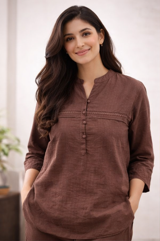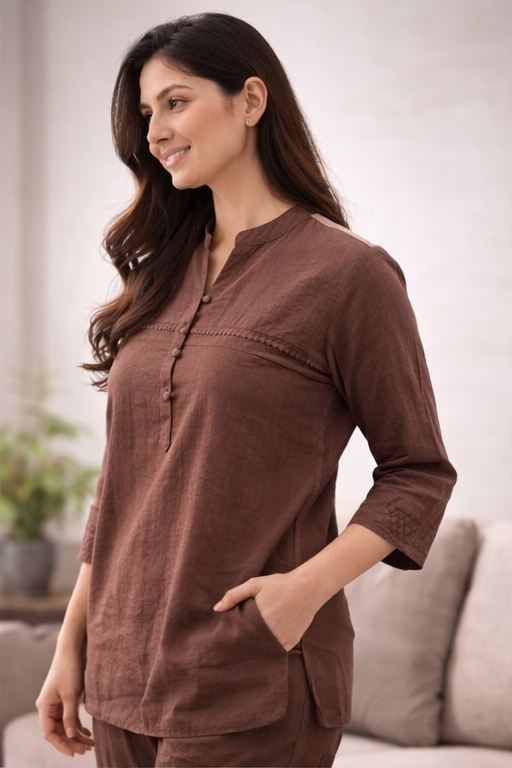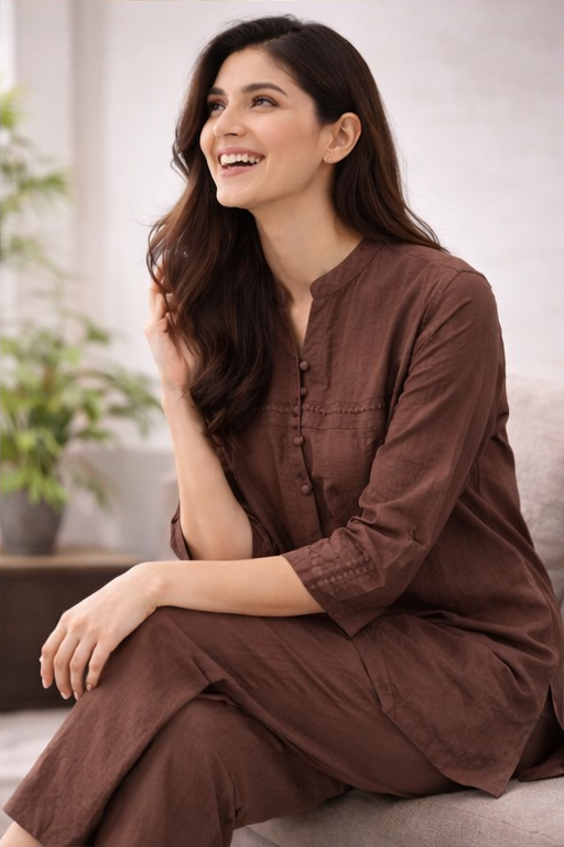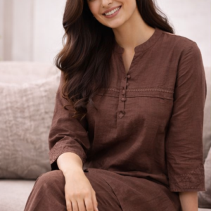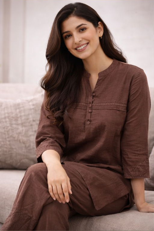 Step into timeless elegance with this women’s brown embroidered long co-ord set, thoughtfully designed for a refined yet contemporary look. Crafted from premium-quality fabric, this two-piece set features intricate embroidery that adds a touch of sophistication and artisanal charm. The rich brown color offers a warm, versatile tone that complements all skin types and suits both daytime and evening occasions.