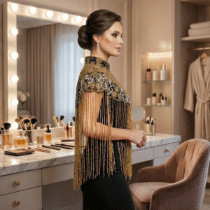 Lightweight yet luxurious, this cape can be paired effortlessly with gowns, sarees, lehengas, bodycon dresses, and party wear outfits. It requires no heavy jewelry—its stunning embellishments do all the talking. If you’re looking for a bold statement piece that transforms your entire look, this cape shrug is the ultimate choice.