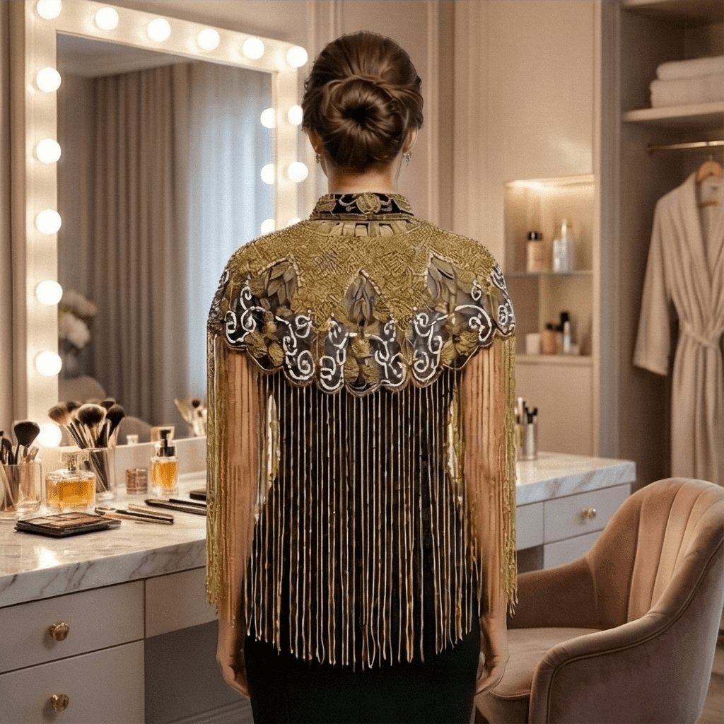 - Golden beaded cape for women
