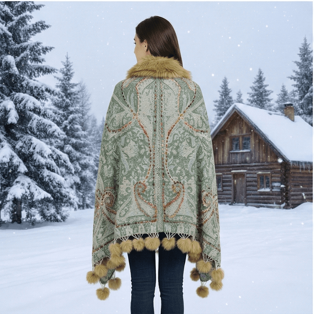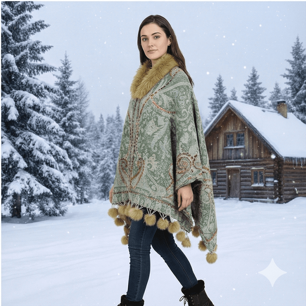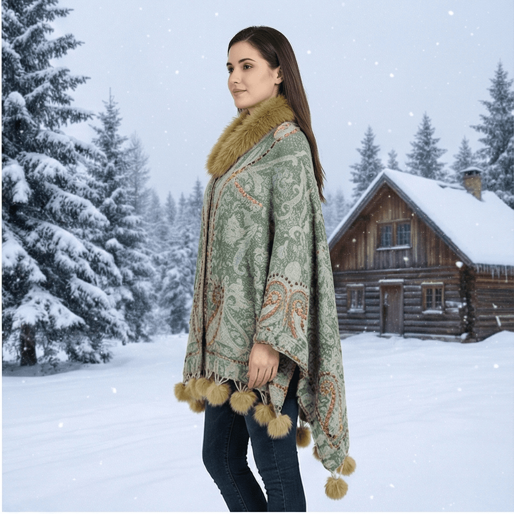Step into winter elegance with this Women’s Luxury Green Paisley Winter Poncho, crafted from a premium wool-blend fabric that provides exceptional warmth and softness. Featuring a beautifully woven paisley design in soothing green and pastel tones, this poncho brings a refined and sophisticated charm to your winter wardrobe.